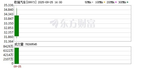 本次IPO中,奇瑞汽车定价30.75港元/股,共发行约2.97亿股H股。其中,香港公开发售约0.297亿股,占比10%;国际发售约2.677亿股,占比90%,并设15%超额配股权。截至9月25日收盘,奇瑞汽车股价先升后落,最终报收31.92港元,涨幅为3.8%。